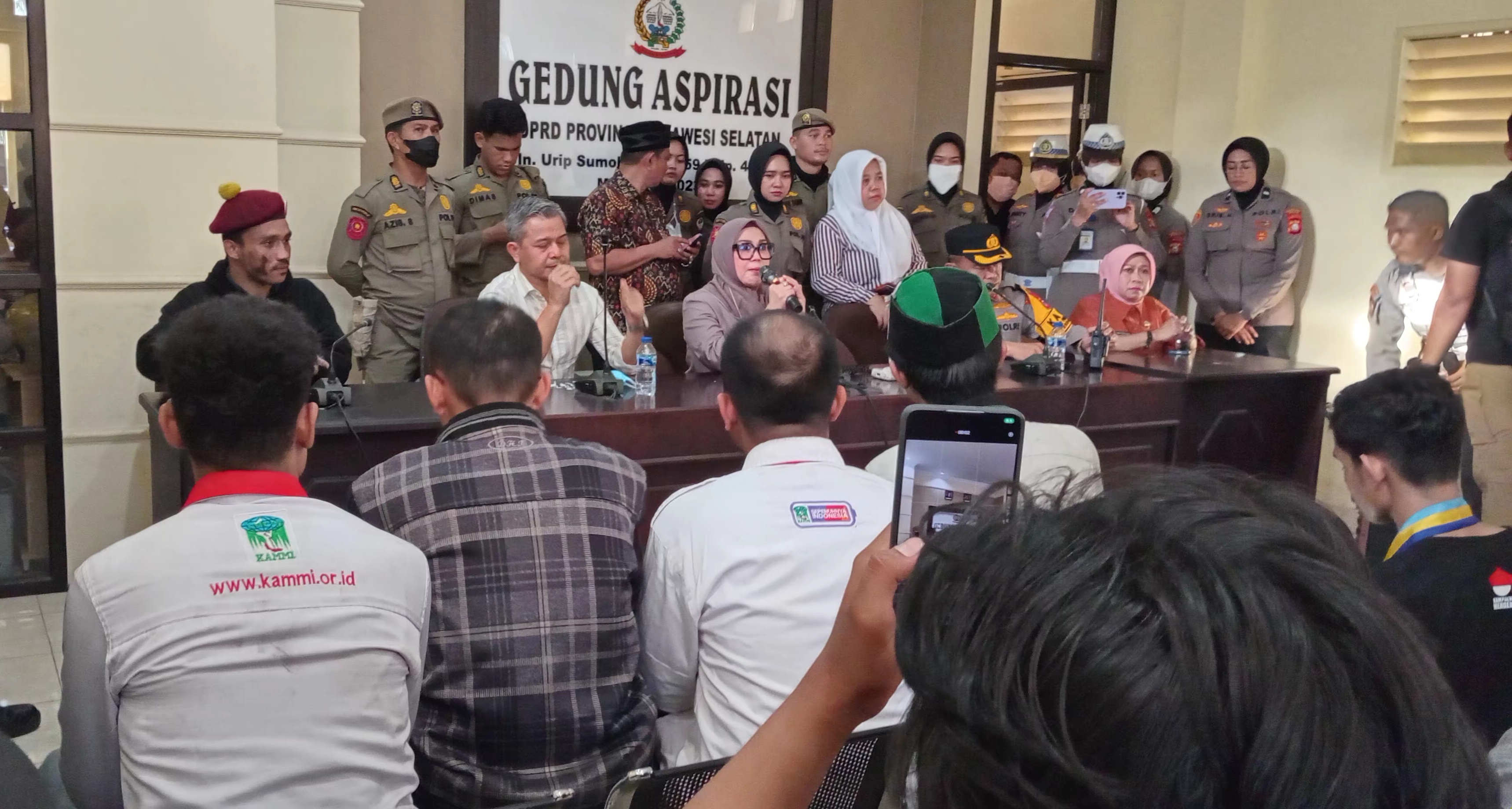 DPRDSULSEL - Ketua DPRD Sulsel, Andi Ina Kartika Sari bersama anggota DPRD Sulsel, Andi Januar Jaury Dharwis menerina aspirasi mahasiswa dari berba