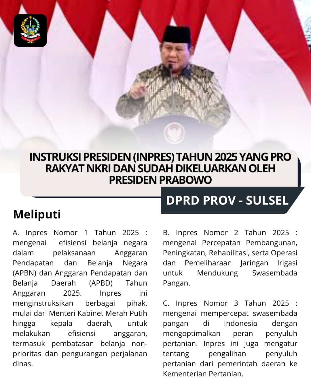 DPRD Provinsi Sulawesi Selatan menyambut positif diterbitkannya sembilan Instruksi Presiden (Inpres) Tahun 2025 oleh Presiden Prabowo Subianto yang